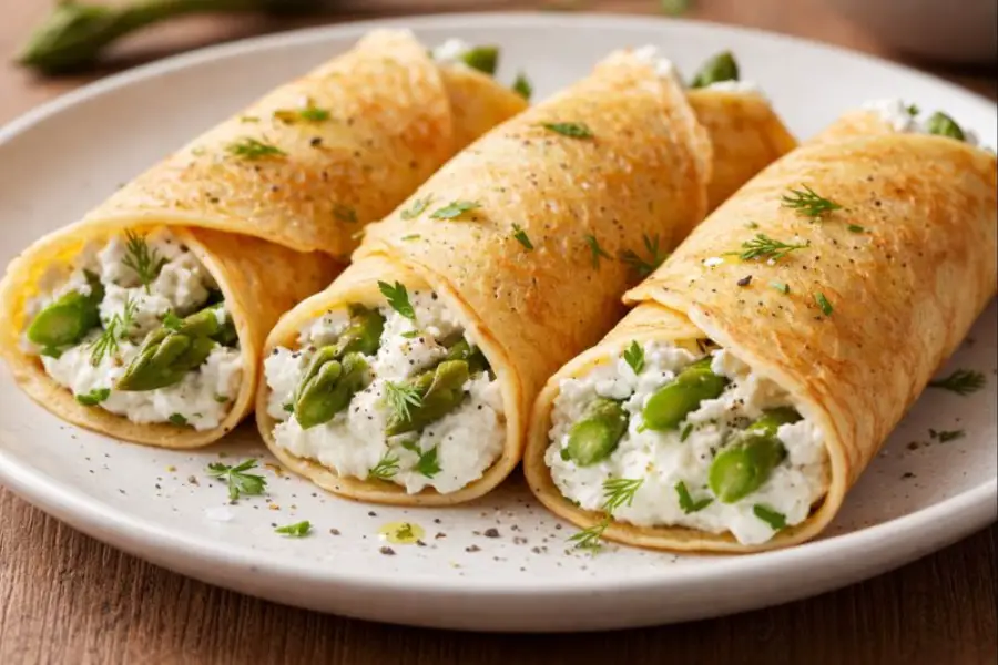 Salteá los espárragos cortados en trozos pequeños hasta que estén tiernos. Mezclalos con la ricota, salpimentá y rellená los crepes. Enrollá y serví tibios.