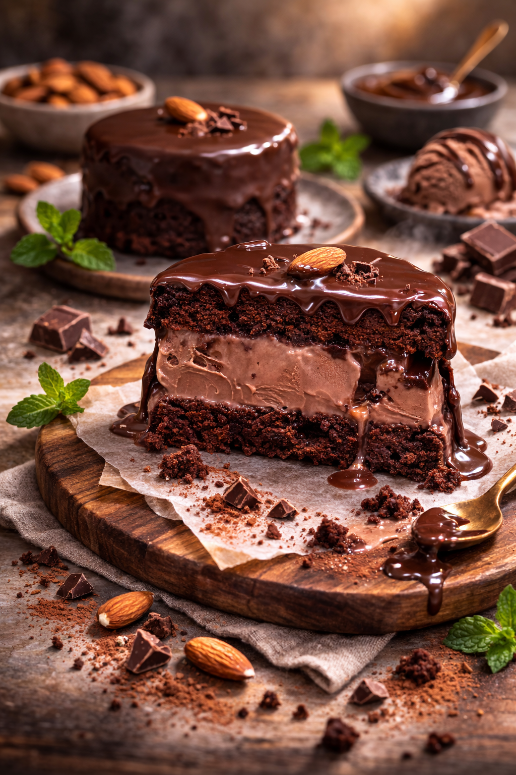 Terminá con una almendra entera arriba de cada uno y algunos trocitos de chocolate. Usá un poquito de ganache que sobre para hacer “charquitos” o hilos alrededor. Decorá el plato con algunas almendras sueltas, un toque mínimo de cacao espolvoreado y hojas de menta.