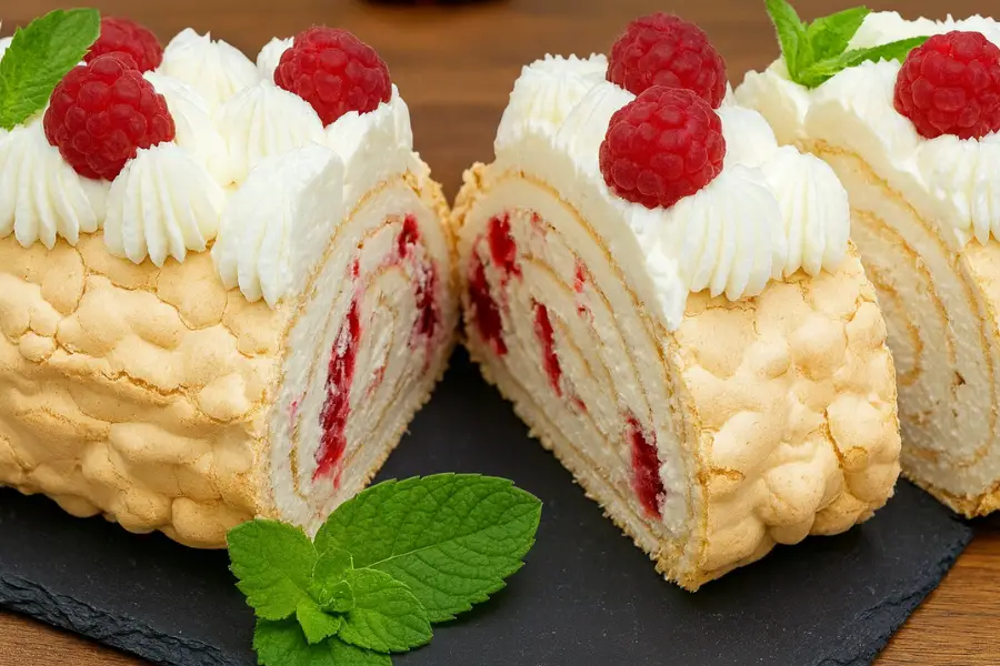 Suave, aireado y con ese toque crujiente que se deshace en la boca, este arrollado de merengue con crema y frambuesas es un postre fresco y elegante.