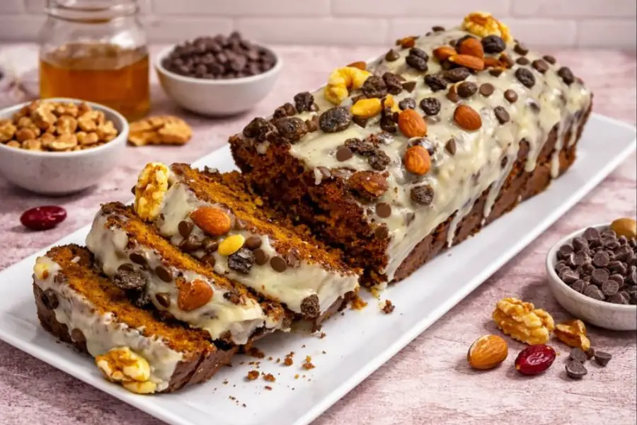 Si se desea, decorar por encima con más frutos secos y chips de chocolate.