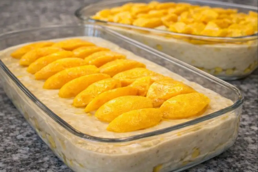 Decorá la superficie colocando las láminas de mango reservadas de forma prolija. Si lo deseás, podés sumar un poco de galleta triturada o ralladura fina de limón para realzar el aroma.