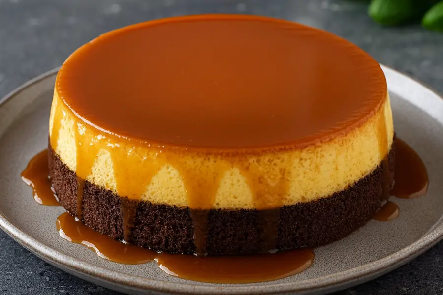 El resultado final es un flan firme y brillante sobre un bizcochuelo húmedo de chocolate, cubierto por una capa de caramelo que cae delicadamente por los bordes.
