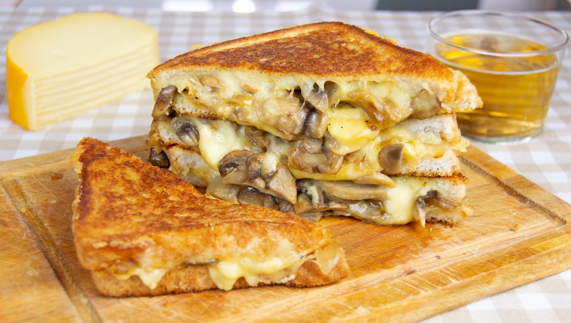 - Colocá una capa de queso, los champiñones y la cebolla, y cubrí con otra capa de queso antes de cerrar el sándwich.