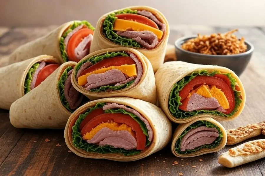 - Opción 1: Jamón de pavo ahumado, lechuga, rodajas de tomate y queso cheddar (2 fetas por wrap). Añadí cebolla frita crujiente si te gusta.