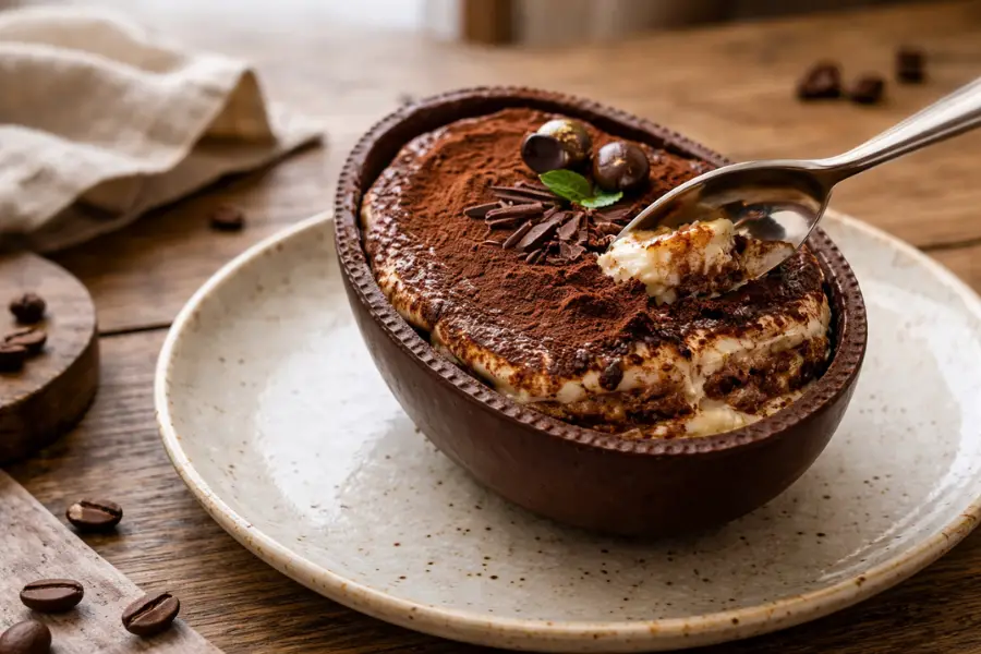 Una versión distinta y muy tentadora del clásico huevo de chocolate, con un relleno cremoso y suave inspirado en el tiramisú.