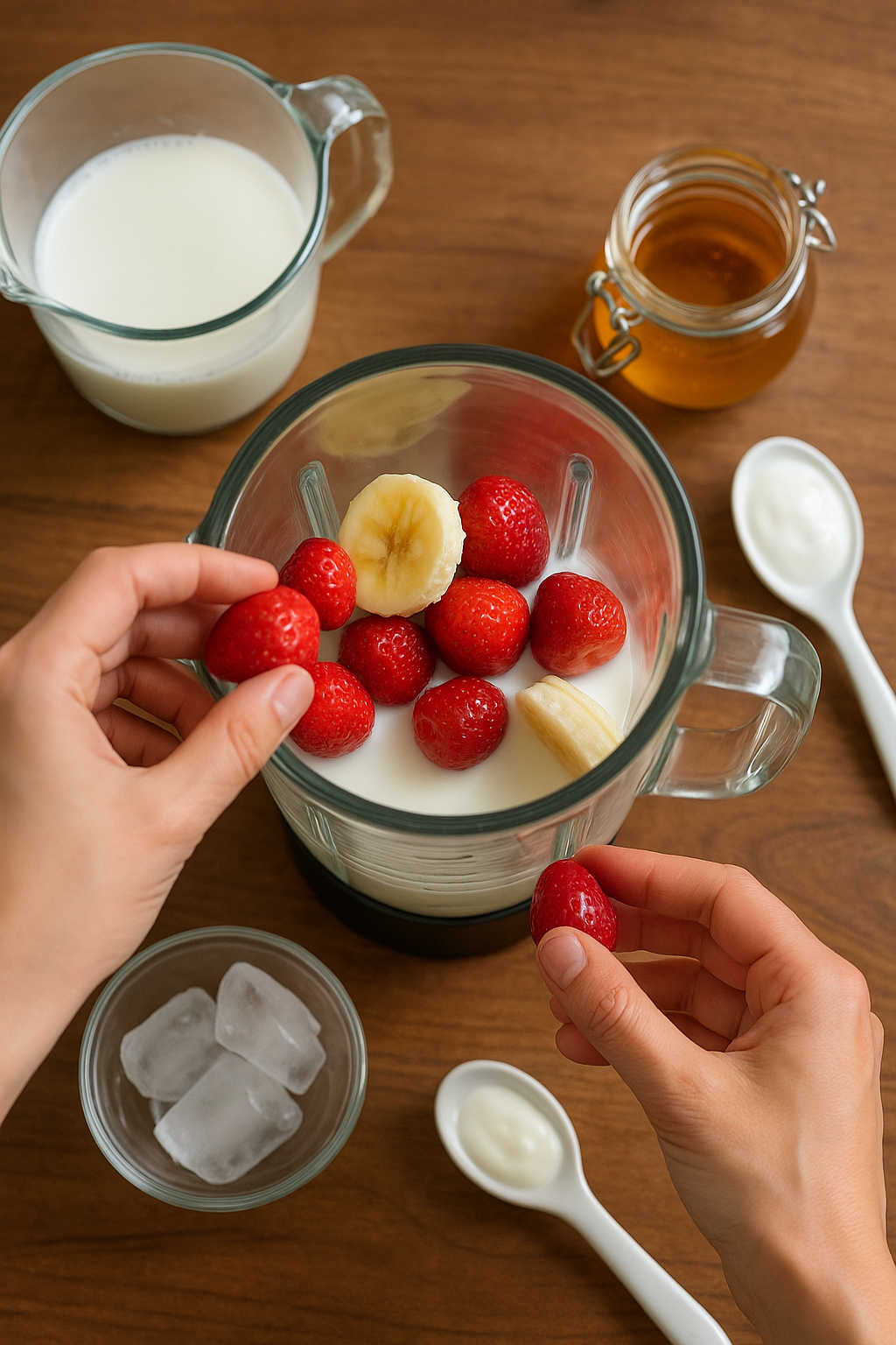Colocá en la licuadora las frutillas, la banana, la leche, el yogur, la miel y los cubos de hielo. Licuá todo a velocidad alta hasta obtener una mezcla uniforme, sin trozos de fruta. Si preferís un licuado más espeso, agregá menos leche; si lo querés más líquido, añadí un chorrito extra. -