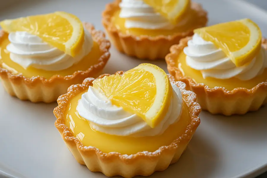 Justo antes de servir, agregar un copo de crema batida y una rodaja fina de limón sobre cada tartaleta para completar la presentación.