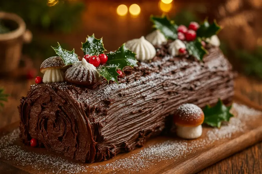 Este tronco navideño es un clásico de las fiestas, con una textura suave y un sabor profundo a chocolate.