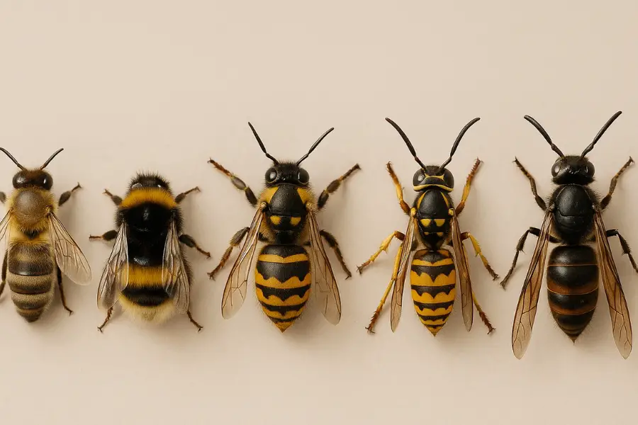 La avispa común se distingue por su cuerpo más liso, sin vellos, y un color amarillo brillante con franjas negras bien definidas.