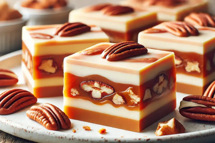 Este dulce de chocolate blanco y caramelo es el equilibrio perfecto entre la suavidad del chocolate, el toque crocante de las nueces y la dulzura del caramelo.