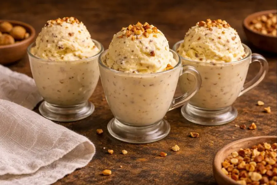 Serví con bocha usando cuchara para helado y, si querés, espolvoreá por encima un poco más de frutos secos picados.