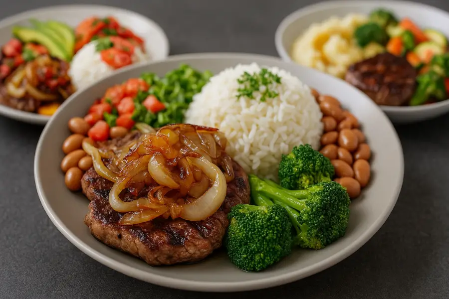 1. Bife a la plancha con cebolla dorada, arroz blanco, porotos y brócoli