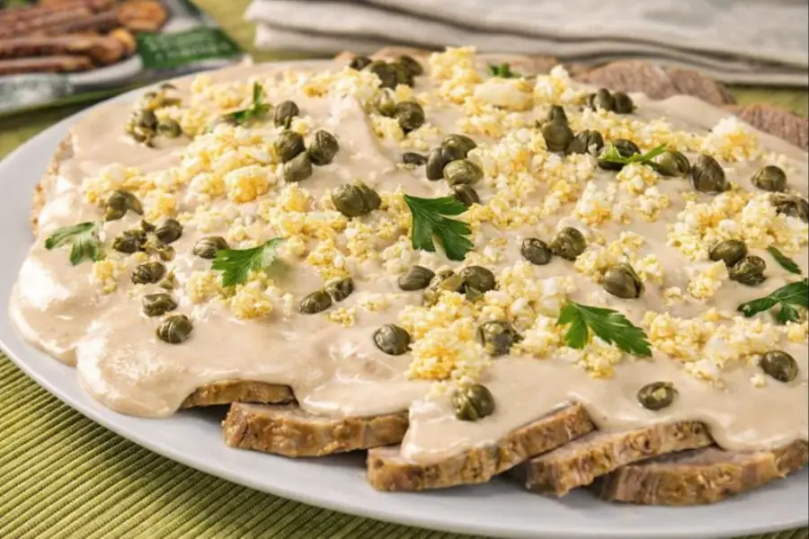 Se cocina la pechuga de pollo hervida o al horno hasta que quede tierna, se enfría y se corta en fetas finas. La salsa se prepara mezclando mayonesa, atún, anchoas, alcaparras y un chorrito de crema o leche. Se cubre el pollo con la salsa y se deja en heladera unas horas antes de servir.