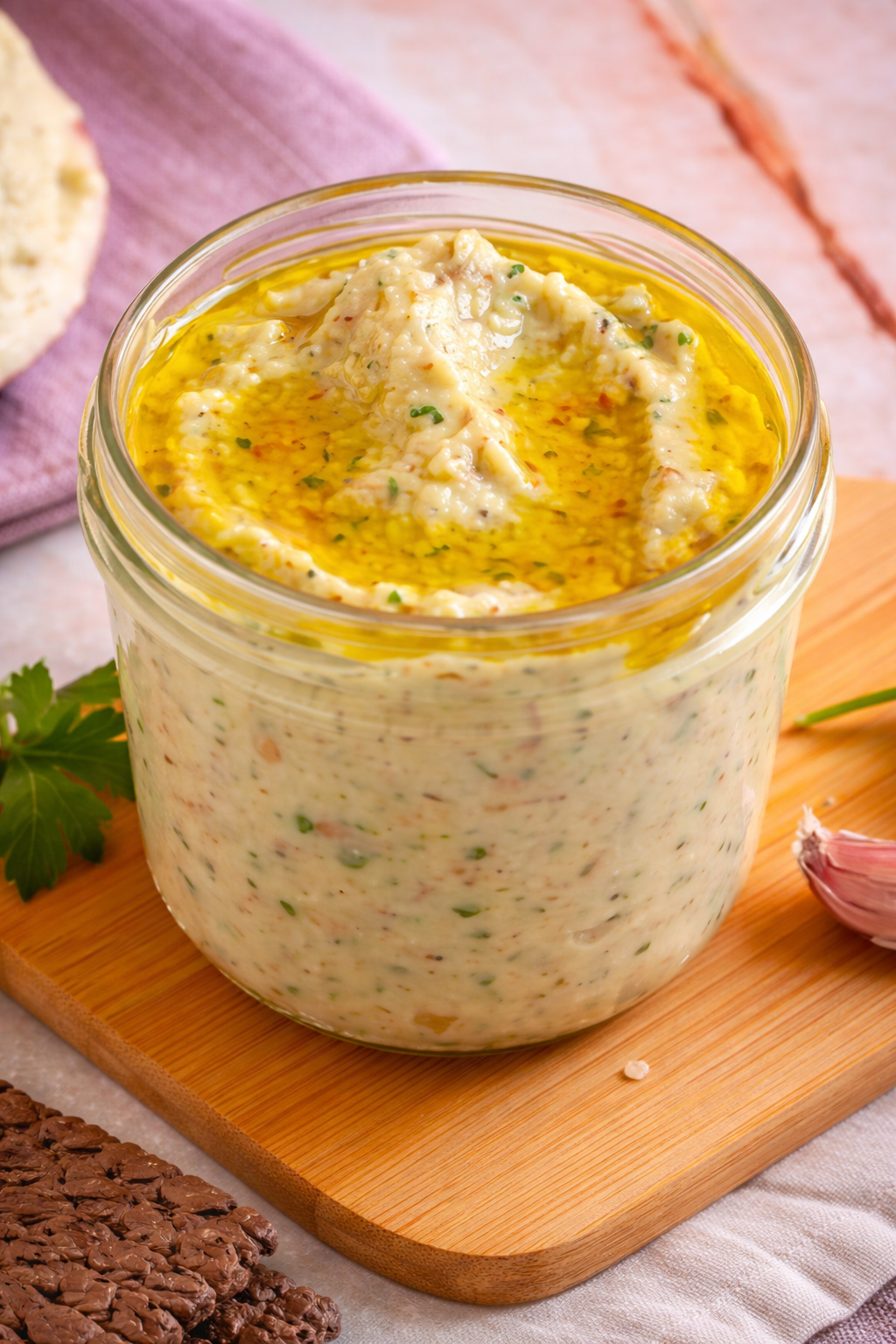 - Transferir el pesto de berenjena a un frasco de vidrio limpio y seco, aderezar con un chorrito adicional de aceite de oliva y servir.