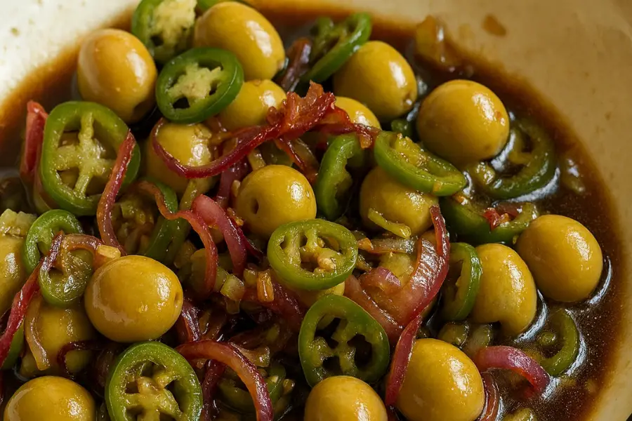 Volcar el contenido caliente de la sartén dentro del bowl. Mezclar todo con suavidad para que las aceitunas, la cebolla y los jalapeños se bañen por completo en la mezcla. Dejar reposar algunos minutos para que el sabor se concentre y se integren los aromas.