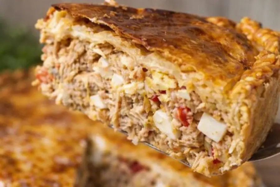 Una tarta contundente, de esas que al cortar muestran un interior abundante y sabroso.
