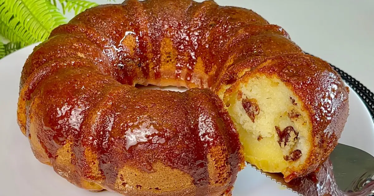 - Retiramos la torta del horno y desmoldamos sobre una bandeja o un plato y por encima le ponemos el caramelo.