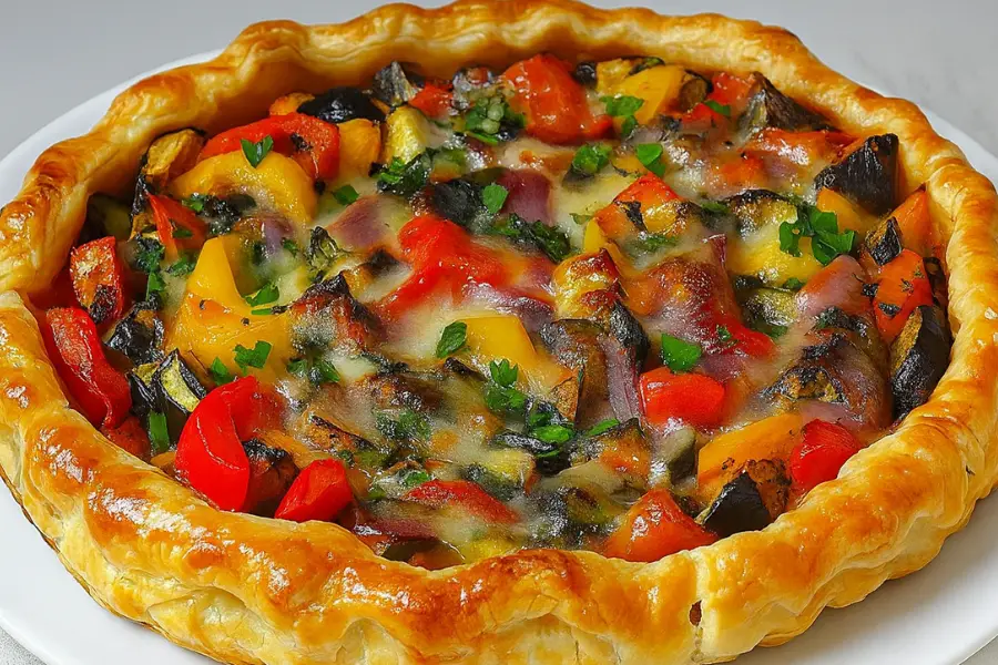Esta tarta combina verduras doradas, bien sazonadas y llenas de sabor, con un borde de hojaldre crocante y brillante.