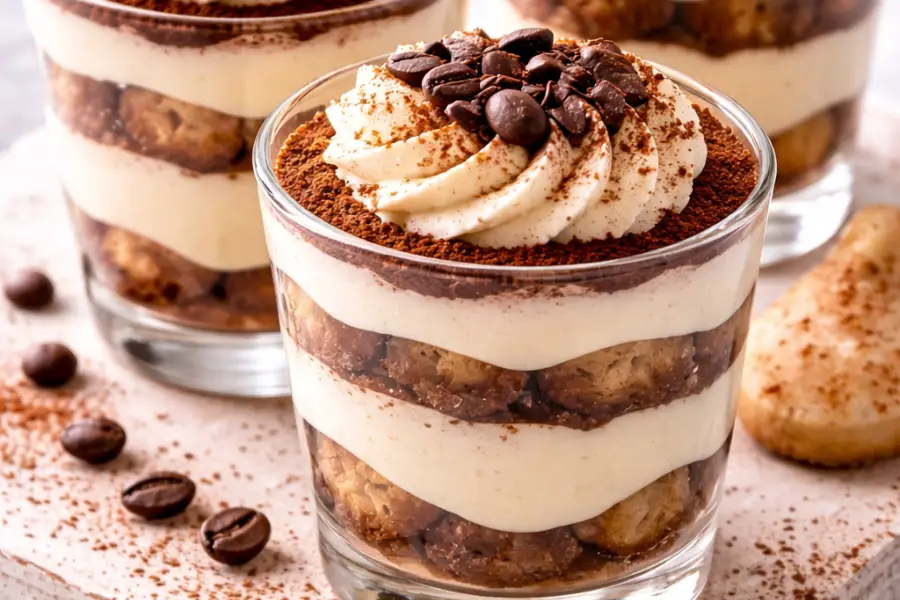 Un postre clásico italiano presentado en formato individual, con capas suaves y bien marcadas que combinan café, crema y cacao.