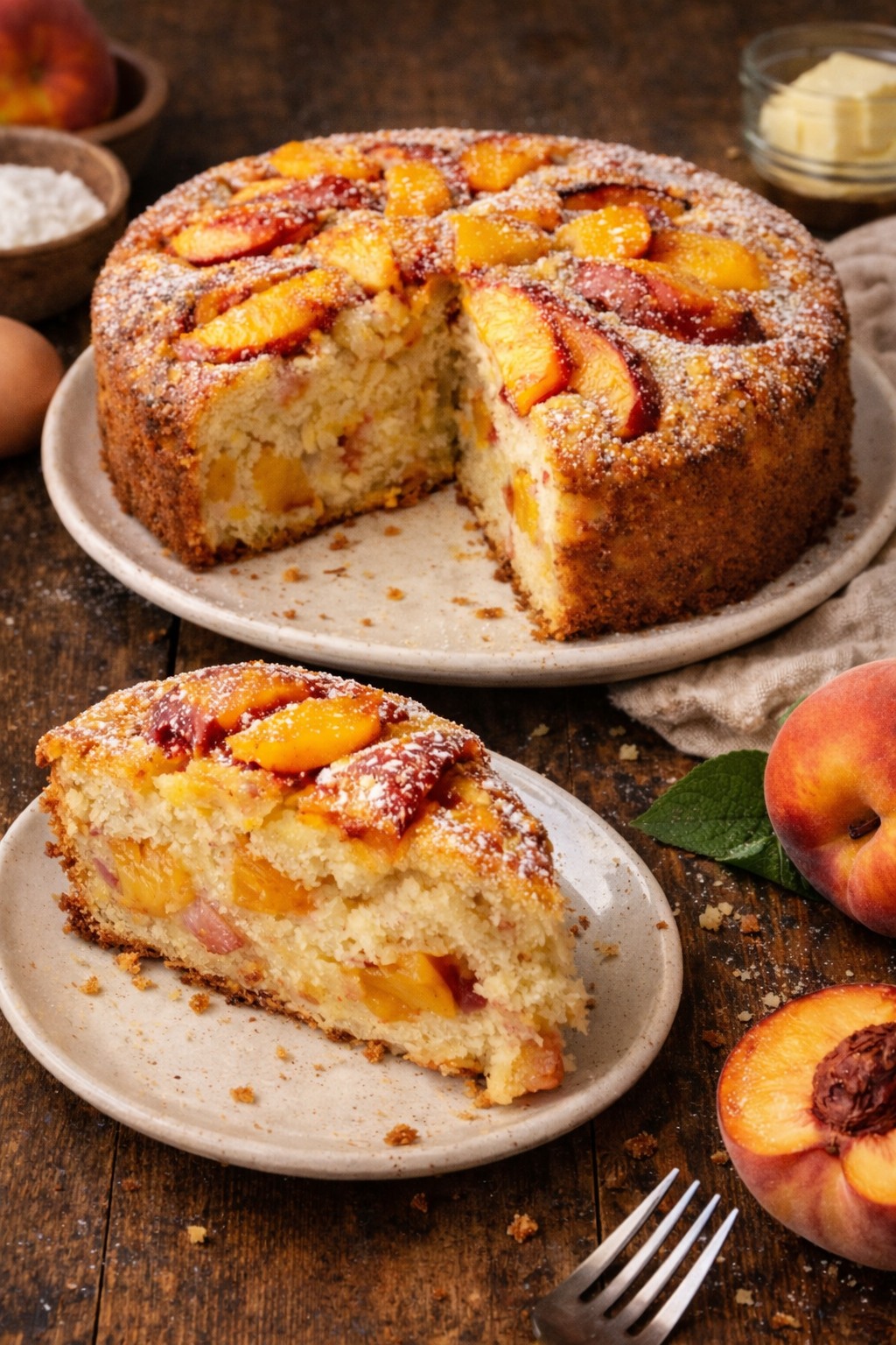 Queda una torta grande, bien tierna y con duraznos repartidos en cada porción, con una superficie dorada que la hace lucirse apenas la cortás.