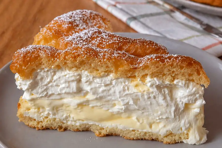 Esta torta se caracteriza por una base crocante por fuera y muy liviana por dentro, con un relleno abundante de crema suave y una capa más densa que le da estructura.